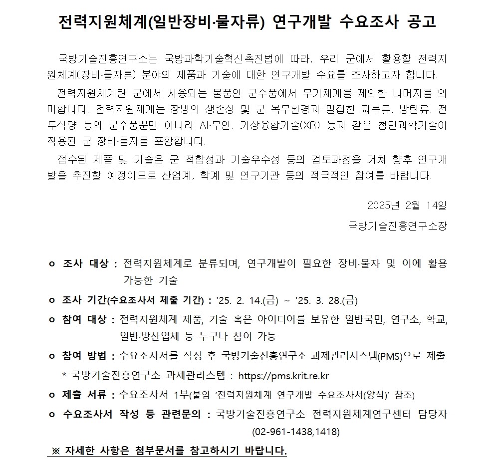 국방기술진흥연구소에서 국방기술진흥연구소에서 군 활용을 위한 전력지원체계분야의 민간 최신기술과 제품에 대한 연구개발 수요조사를 조사하고 있습니다.